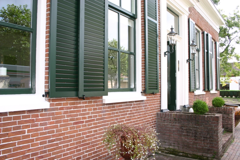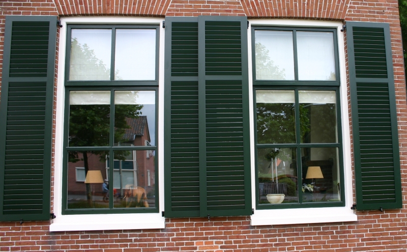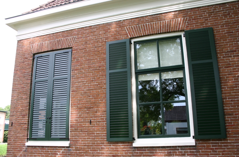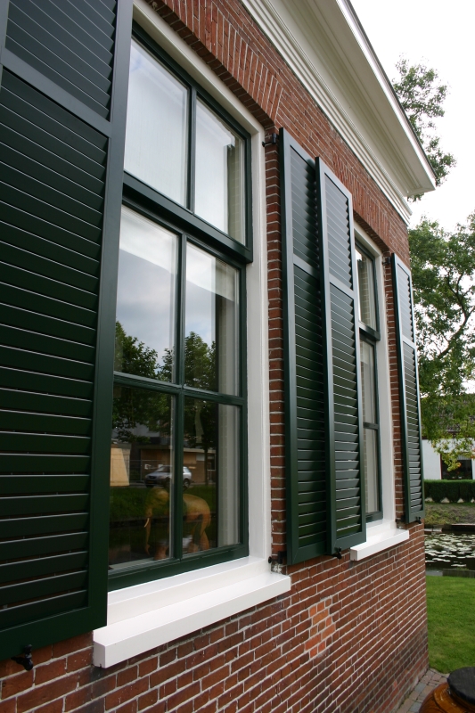 De luiken passen geheel bij het karakter van de woning. De tussendorpel van de luiken strookt met de raamindeling. Daar waar de ruimte tussen de ramen wat kleiner is hebben we het luikbeslag aangepast zodat de luiken netjes over elkaar heen draaien en vastgezet kunnen worden in geopende stand.