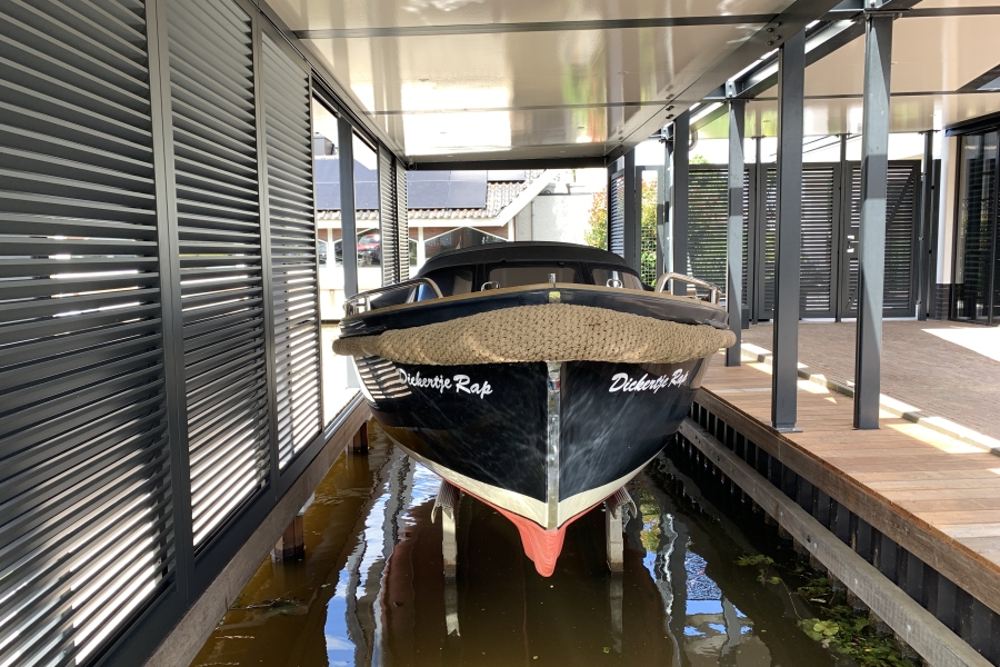 Op deze prachtige locatie mochten wij de aanlegsteiger voorzien van aluminium schuifluiken, met daarnaast een loopdeur en een aantal vaste schermen met zowel lamellen als gaas.